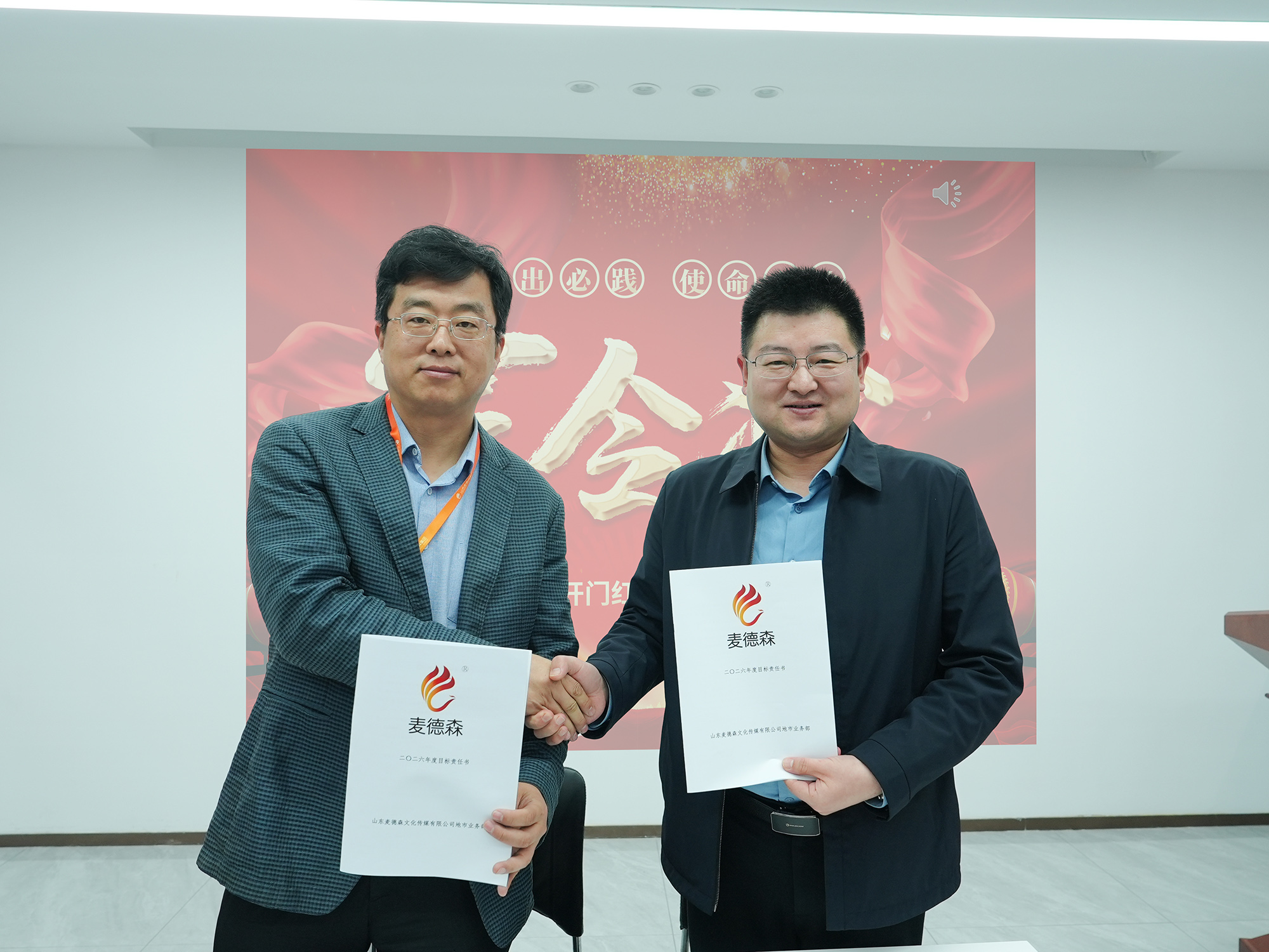 2月28日,山东麦德森发展集团旗下山东麦德森文化传媒有限公司在博新楼二楼大会议室召开2026年度战略落地暨工作动员会。本次大会以“创新·融合·突破”为主题,总结过往发展成绩、表彰先进典范、部署年度战略、签订目标责任书。集团党委书记、董事长王勇;集团总经理张天君;麦德森文化传媒公司总经理张永华等出席,文化传媒全体员工参加会议。