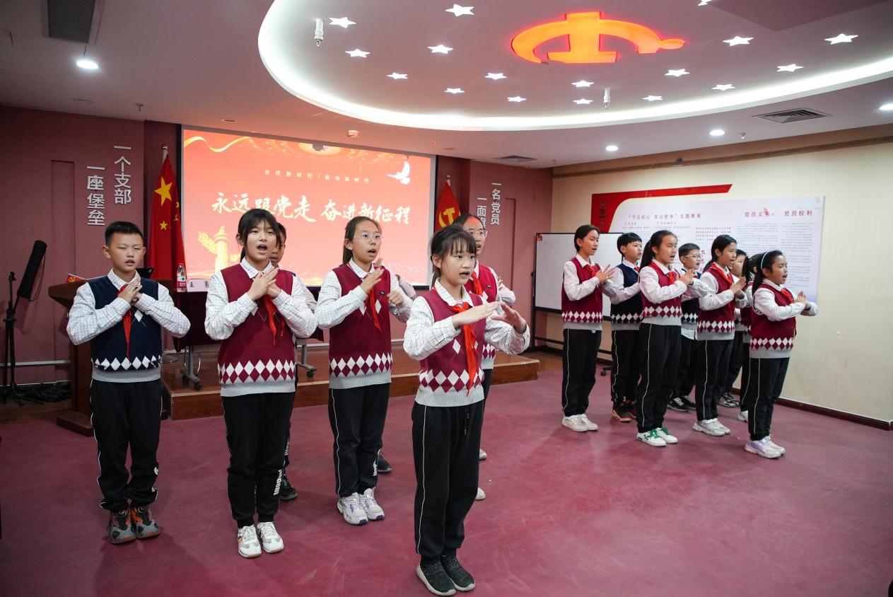 互动交流期间,少先队员代表为王勇叔叔送上鲜花,佩戴红领巾。一曲《强国少年》展现了少先队员们爱国、爱党、爱生活,积极向上的精神风貌。