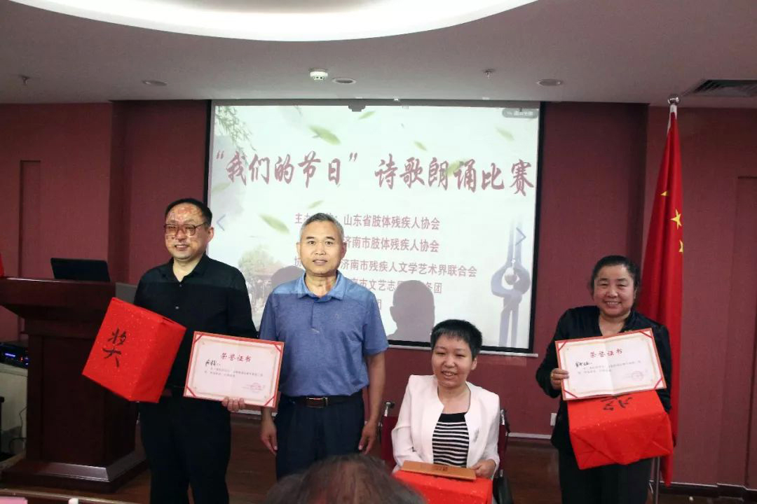 为庆祝第二十九次全国助残日,丰富残疾朋友的精神文化生活,展示残疾朋友积极向上,奋发进取的自强精神,5月24日由山东省肢体残疾人协会、济南市肢体残疾人协会联合主办,济南市残疾人文学艺术界联合会、济南市文艺志愿者服务团协办,山东麦德森集团策划并承办的首届“我们的节日”残疾人诗歌朗诵比赛活动在山东麦德森集团党群活动室成功举办。济南市残联副巡视员王建国,济南市残联维权处调研员杜献松,山东麦德森集团党支部书记、济南市肢体残疾人协会、济南市残疾人文联主席王勇博士,济南市残文联作家协会主席韩振广、济南市残文联作家协会副主席房泽岸等领导出席本活动。赛事主办方特别邀请济南市市中区人大调研员、著名女诗人张斌、济南市评论家协会副主席窦洪涛、原山东大学文学院院长著名作家耿建华教授、原山东青年报社社长兼总编柳原担任此次赛事的专家评审;来自济南市各区县的16位残疾选手参加比赛。